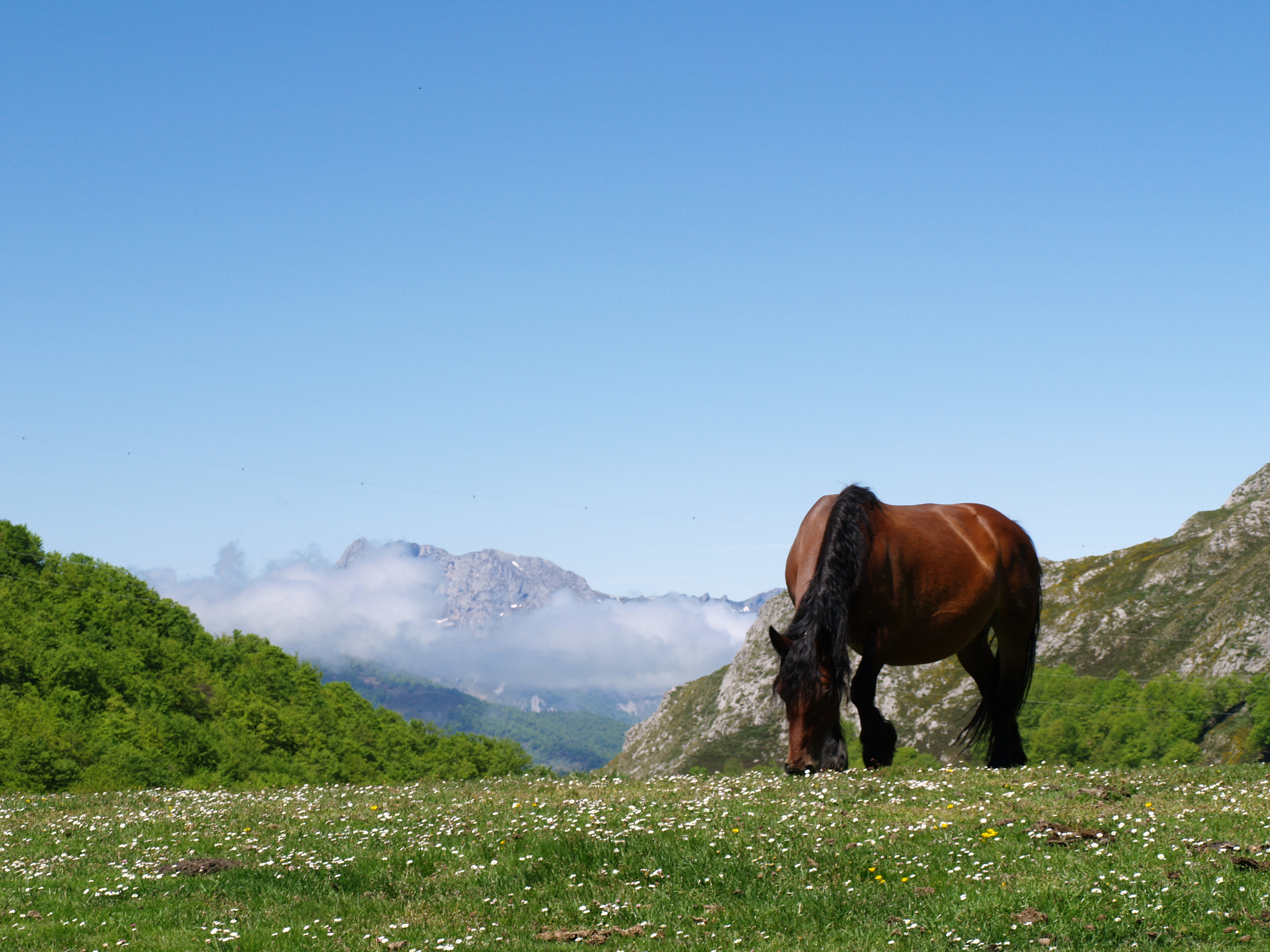Seguiremos un sendero a media ladera que de inmediato inicia el descenso hacia la Vega de Toneyo o Toneyu, enorme Vega salpicada de pequeñas cabañas, desde aqui tendríamos una impresionante vista de las cumbres del Cornión (Macizo Occidental) que rodean la zona del Mirador de Ordiales pero dada la niebla que hubo, no pudimos disfrutar del paisaje.