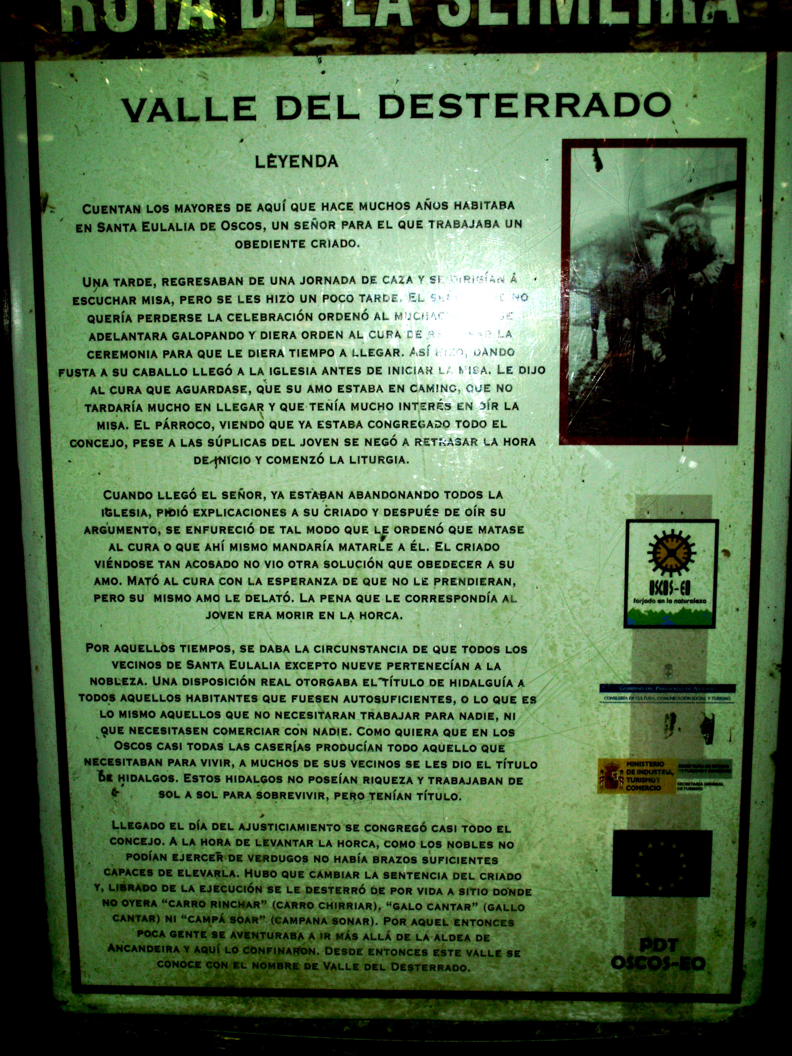 Llegado el día del ajusticiamiento se congregó casi todo el concejo. A la hora de levantar la horca, como los nobles no podían ejercer de verdugos no había brazos suficientes capaces de elevarla. Hubo que cambiar la sentencia del criado y, librado de la ejecución se le desterró de por vida a sitio donde no oyera carro chirriar, gallo cantar ni campana sonar. Por aquel entonces poca gente se aventuraba a ir más allá de la aldea de Ancadeira y aquí lo confinaron. Desde entonces este valle se conoce con el nombre de Valle del Desterrado.