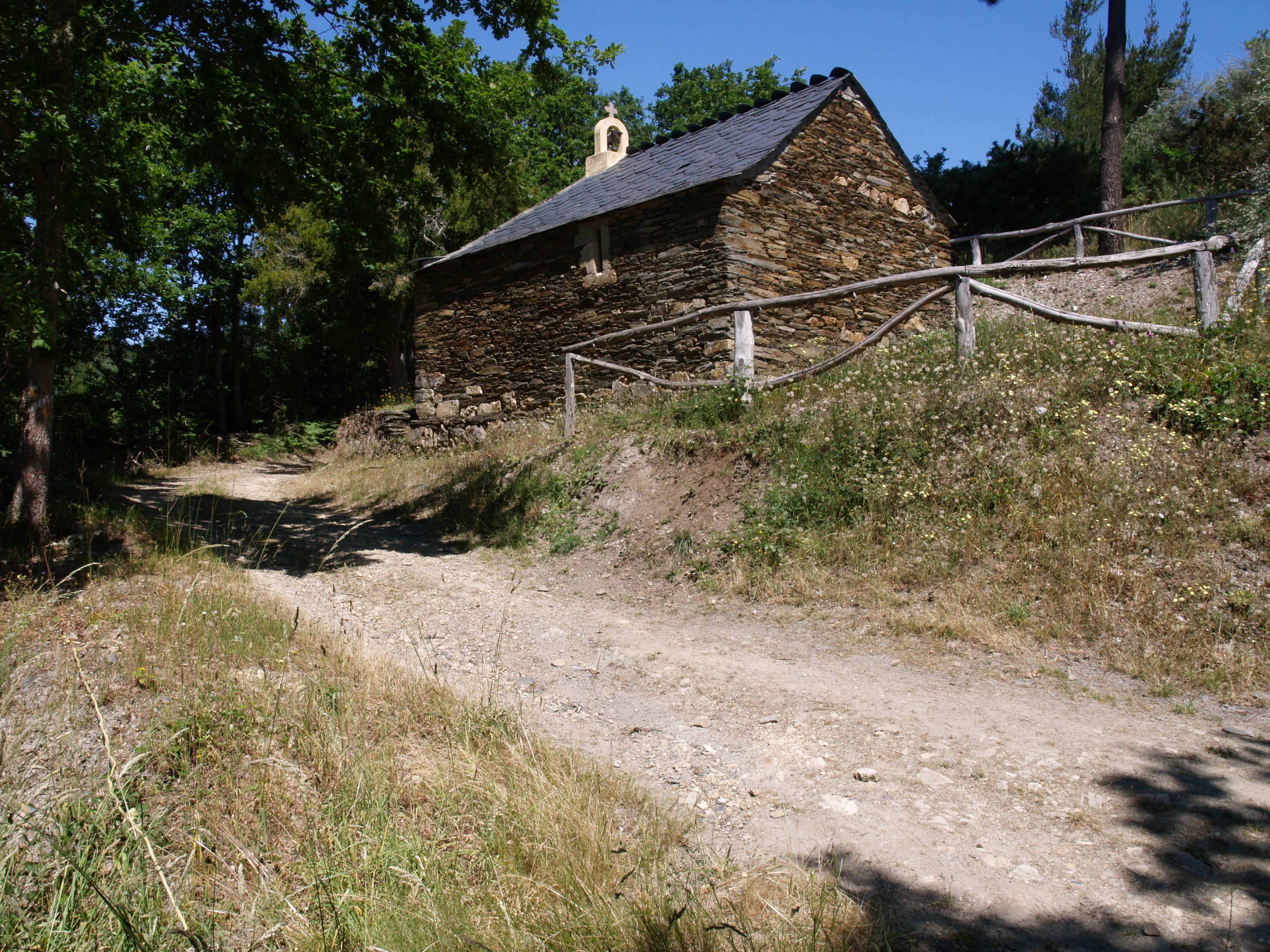 Dejamos la senda de tierra y por carretera asfaltada nos acercamos a la población de As Poceiras, que atravesamos y empezamos a bajar hacia el río Barcia, que cruzamos por un puente y empezamos a subir hasta un pueblo y después la capilla de Nuestra Señora del Carmen, con un tejo al lado.