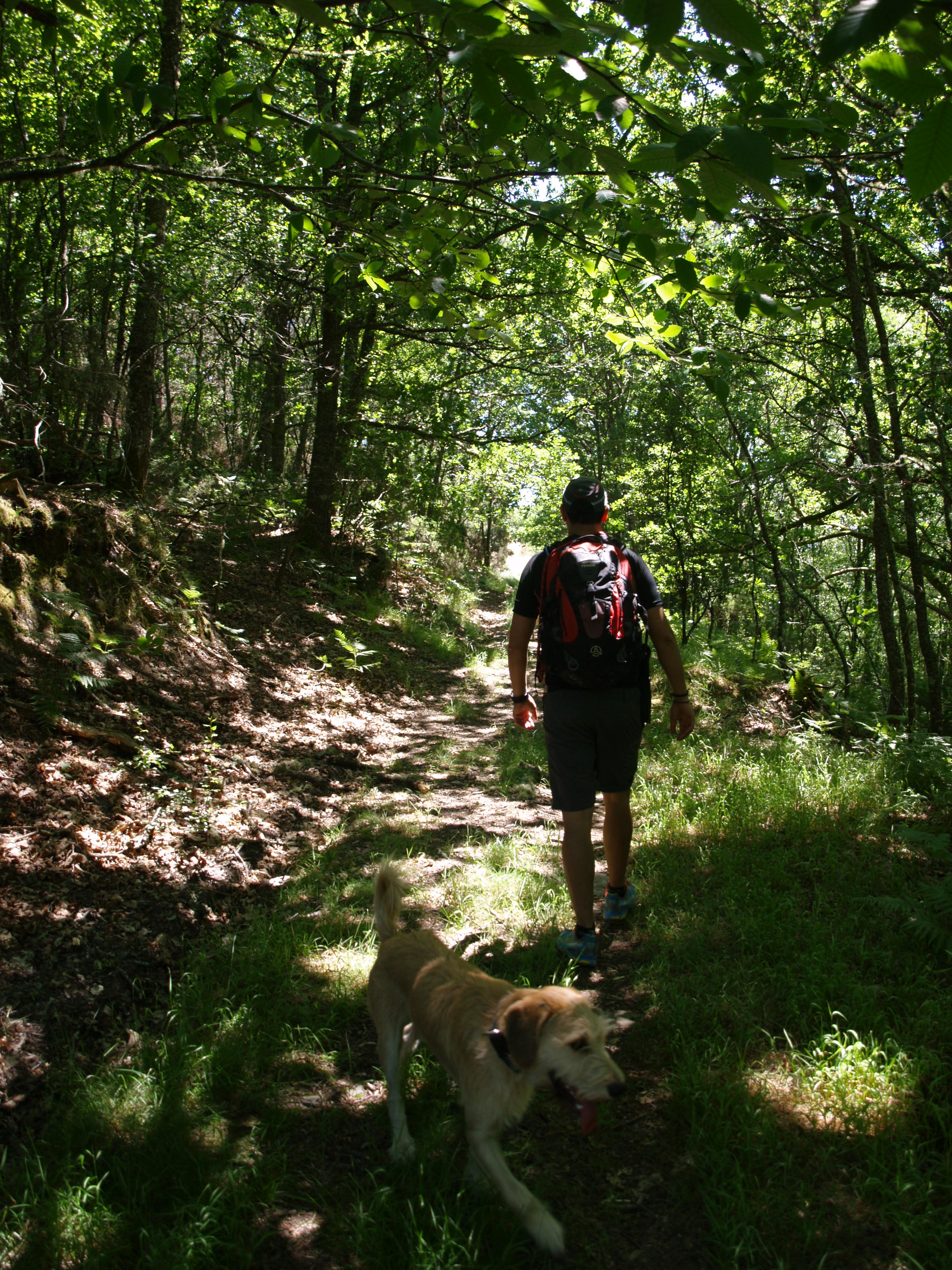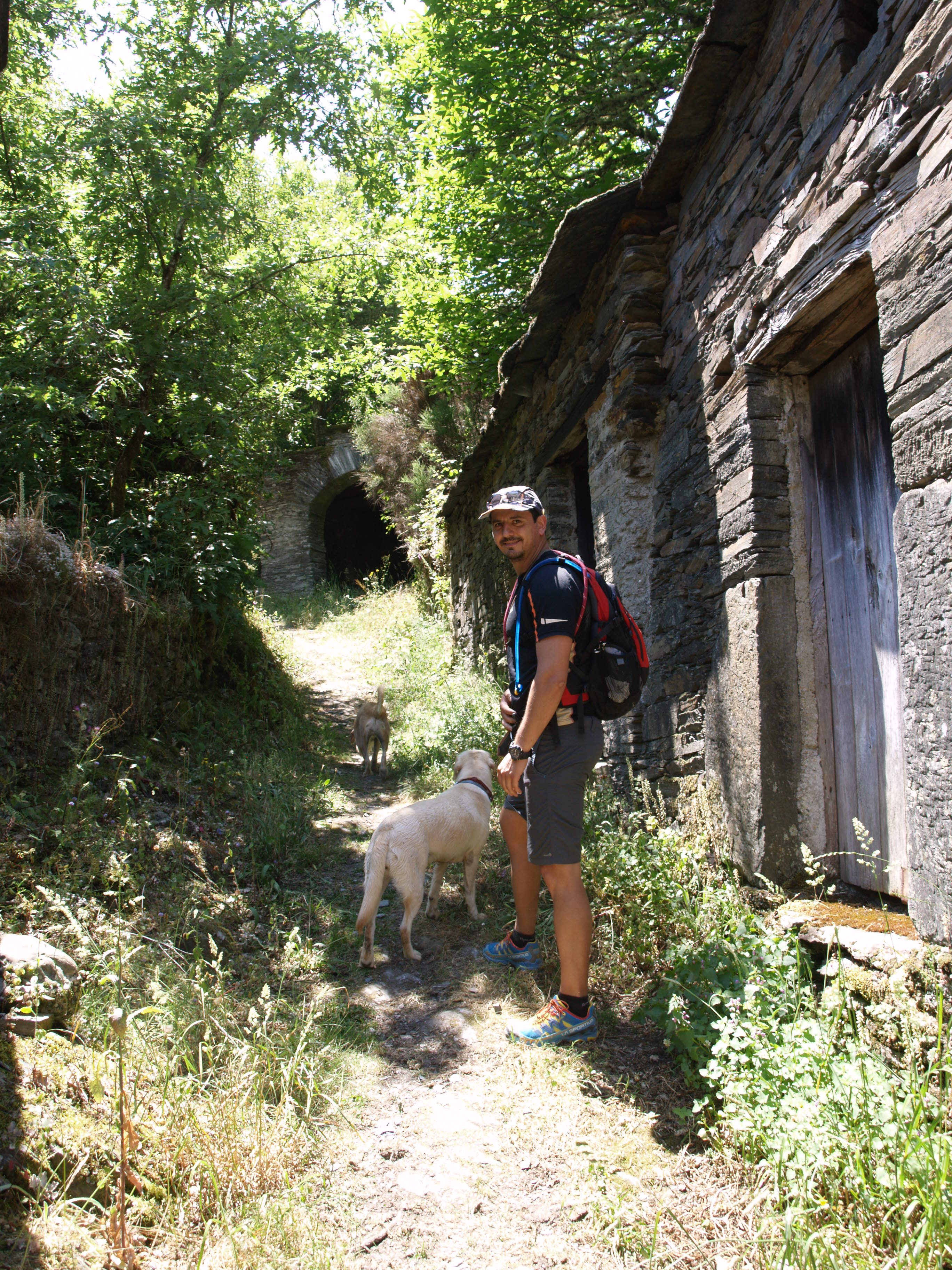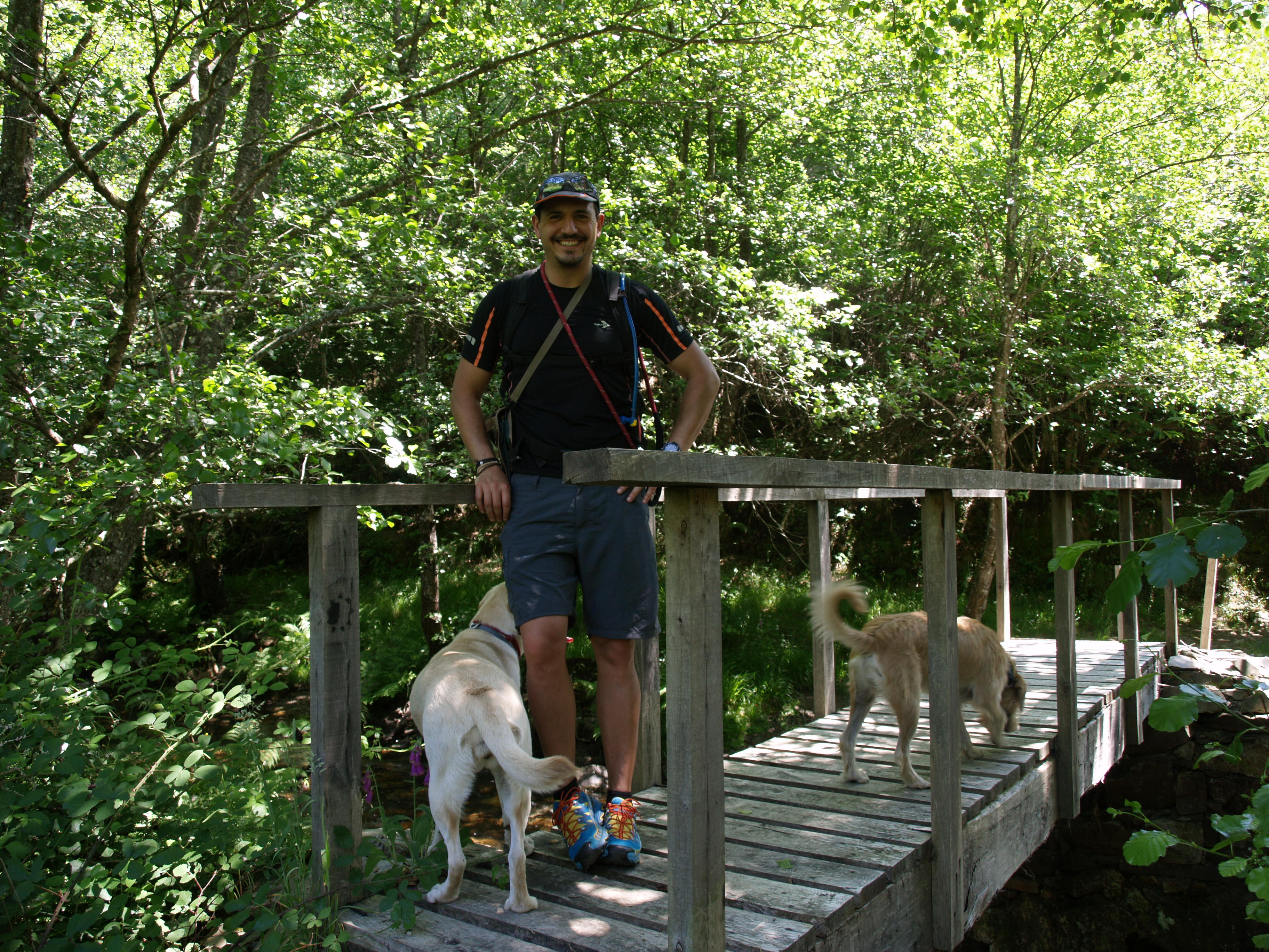 Estas rutas las hacemos en Santa Eulalia de Oscos. El primer día comenzamos en el área recreativa de Pumares donde dejamos la furgoneta. Cruzamos la carretera y nos dirigimos hacía el pueblo de Pumares donde todavía podemos observar los restos de un antiguo mazo. Al final del pueblo y dejando el río Agüeria a nuestra izquierda cogemos un senda que en ligero ascenso nos adentrará en el bosque. Al lado de la senda discurre el río. Cora, en cuanto lo vio, no dudó un momento en ir corriendo a nadar. Coco va perdiendo el miedo (al principio prefería mirar a Cora desde la orilla).