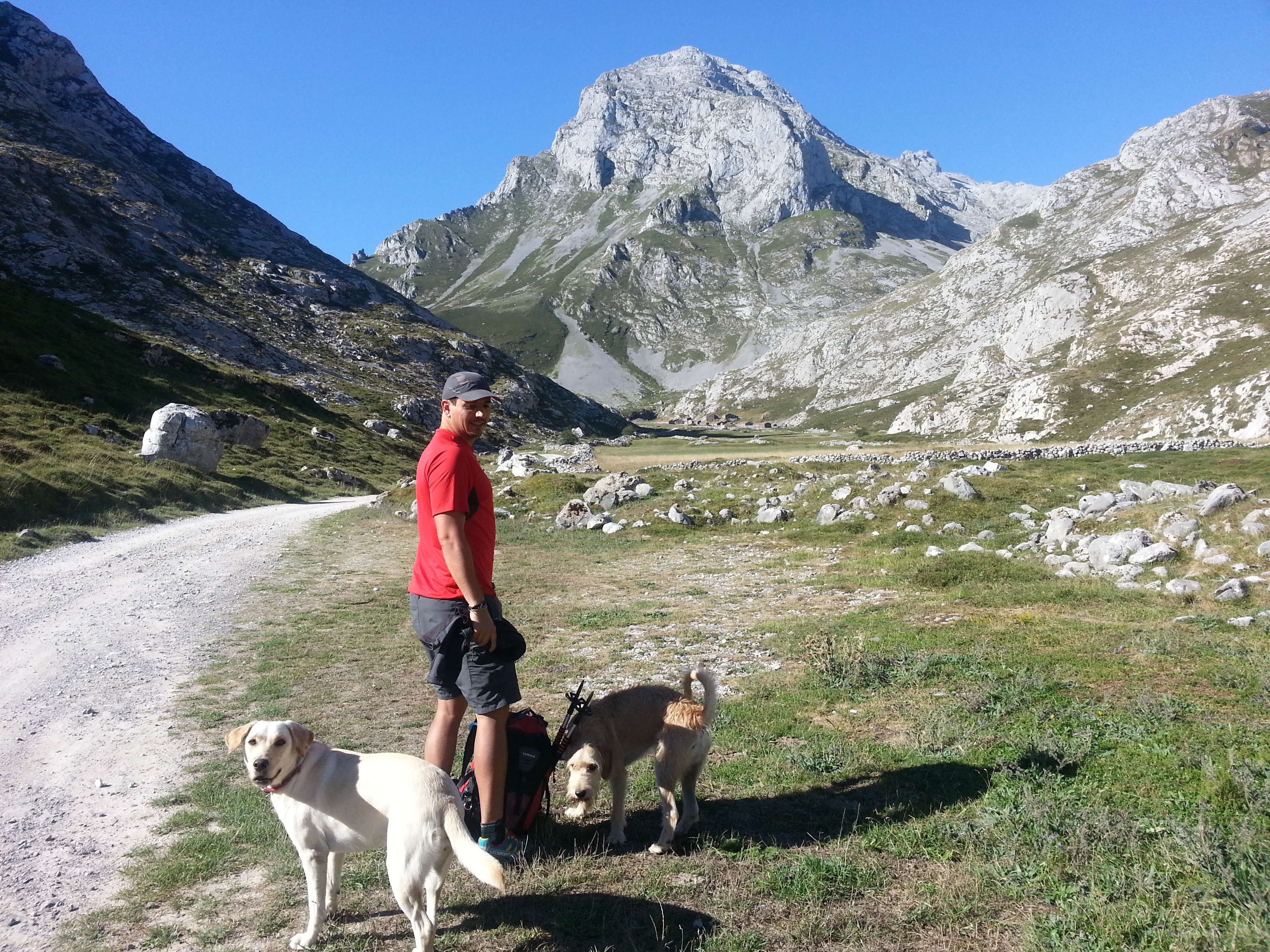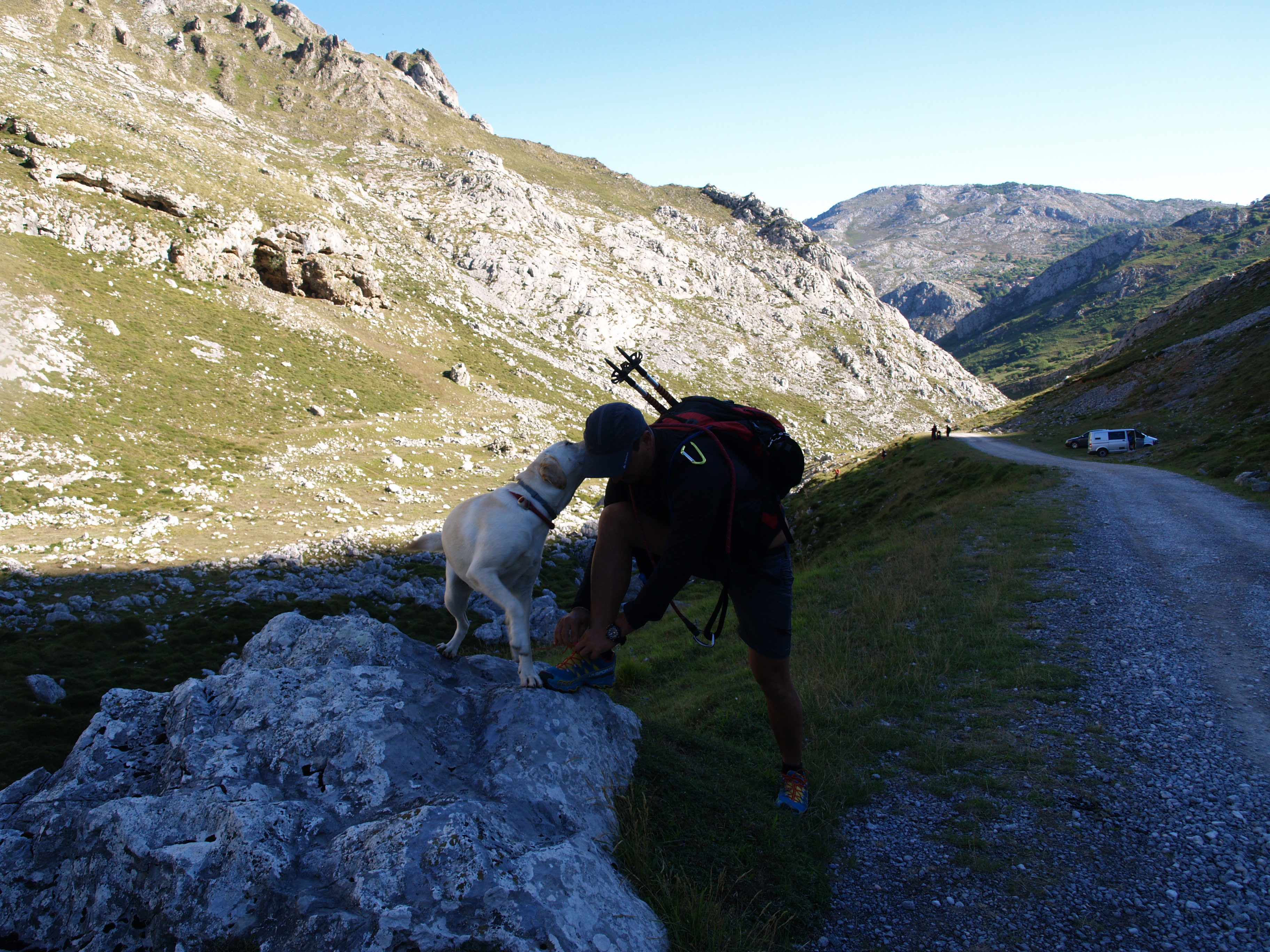 Dejamos la furgoneta en la Curvona, cerca de Sotres. Y a partir de ahí empezamos a bajar hacia una serie de cabañas conocidas como los Invernales del Texu. Allí coincidimos con unos escaladores vascos que tienen previsto subir una de las paredes laterales del inicio de la ruta.